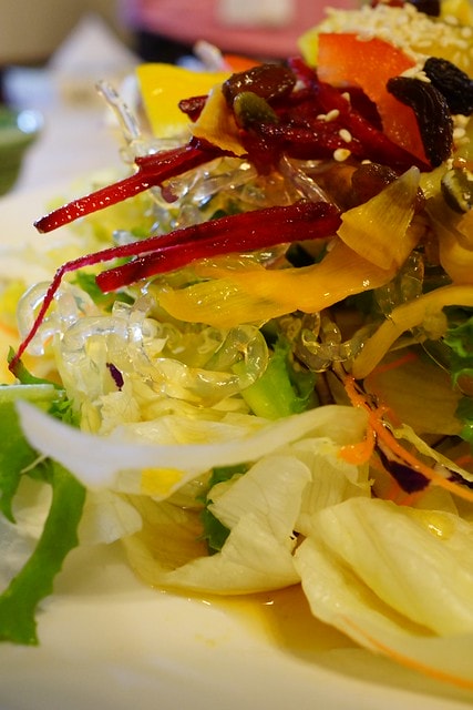 各樣時令的生菜加上紅滋滋的甜菜根與寒天,吃起來爽口又健康