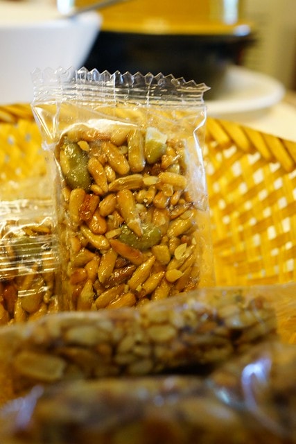桌上擺著的是養身茶與堅果酥還有幾盤自製的特色小菜