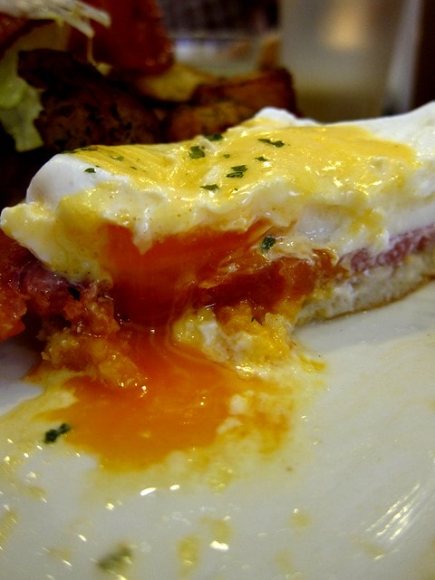然後上頭放上火腿,在火腿上頭則是用小火煮的熟水煮蛋(水波蛋/Poached Egg)