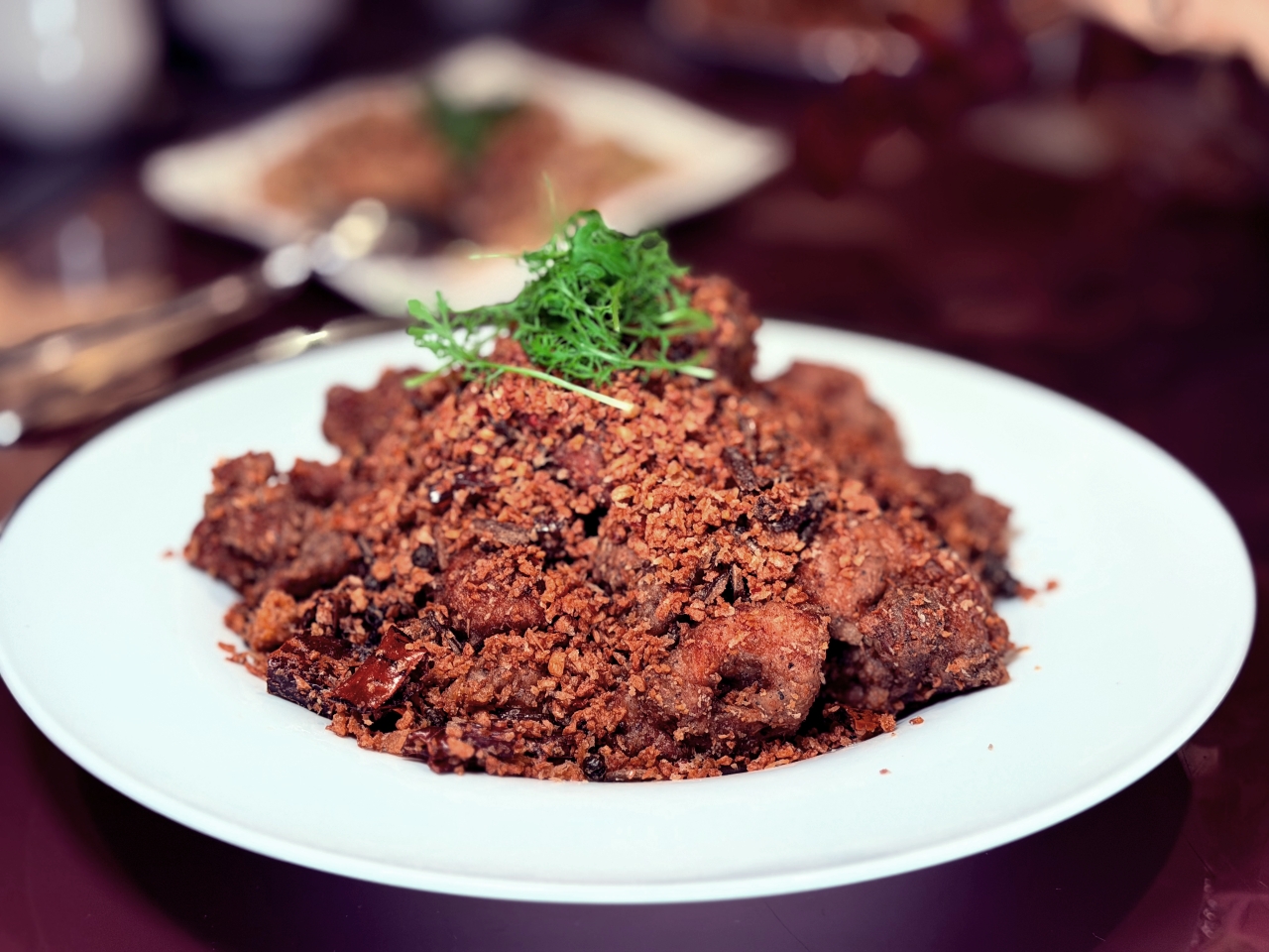 炸至金黃的雞球,裹上避風塘蒜香粉末,混搭野米與藤椒,