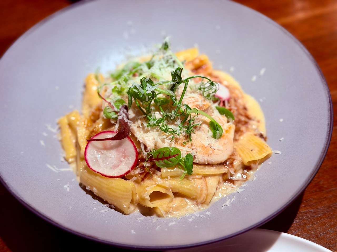 舒肥作法的雞肉鮮嫩,水管麵彈牙又吸飽醬汁。