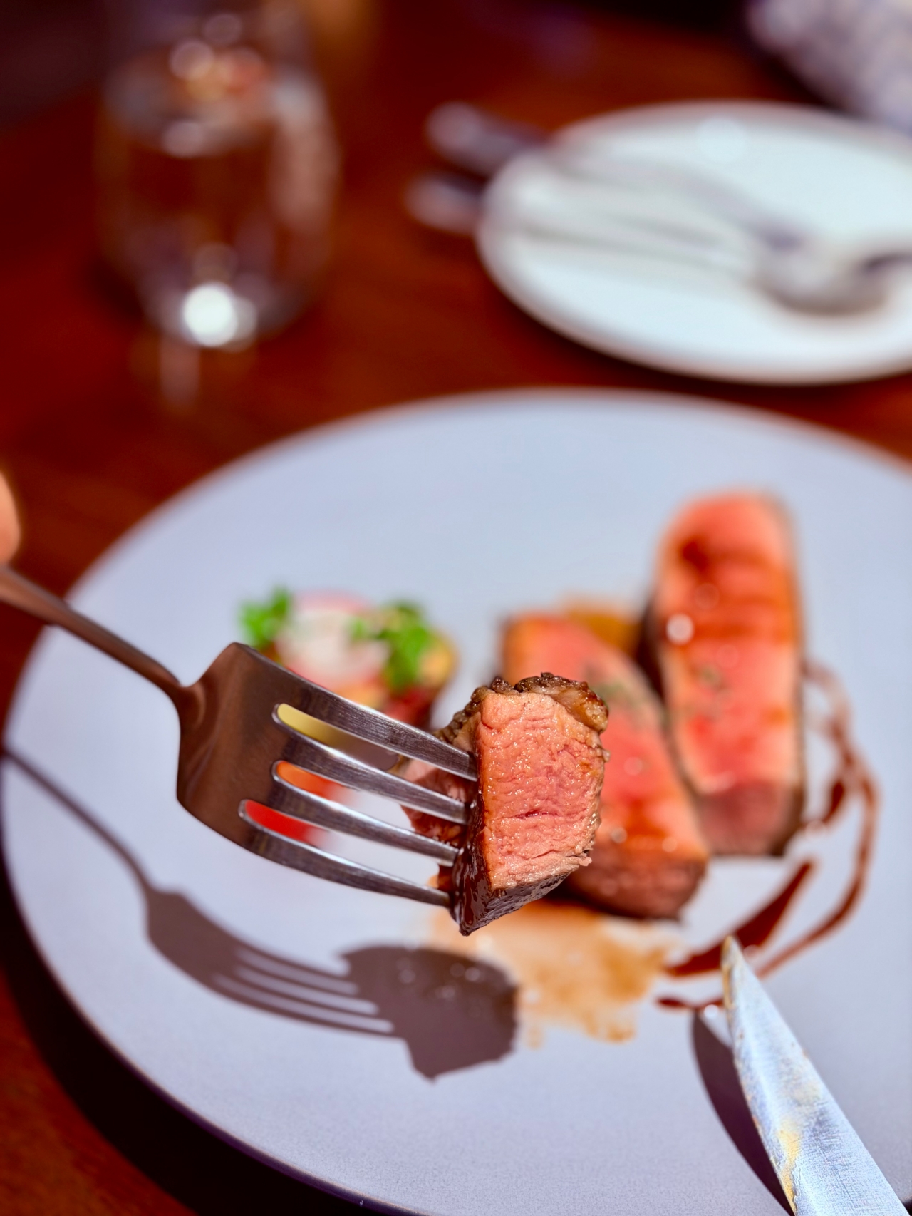 鴨胸粉嫩的切面閃著油光,外皮焦香、肉質柔嫩;