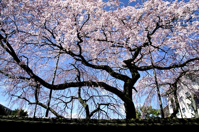 書店前的櫻花樹已綻放且落下的陣陣的櫻花雨;