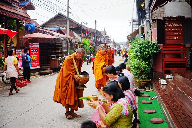 【泰國,東北雷府】泰寮邊境的美麗小鎮,清康(Chiang Khan);晨起,結佛緣;感受泰國和尚托缽化緣的傳統文化。亞洲, 曼谷與近郊, 泰國旅遊昨晚在餐廳的牆壁上看到的那幅畫,和尚走… 快樂雲2016 年 7 月 20 日
