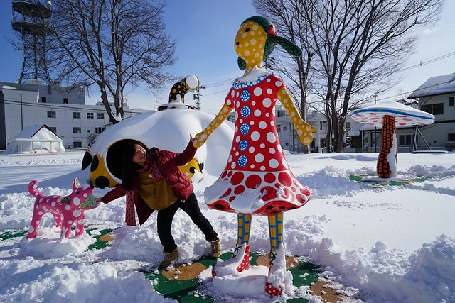 旁邊那被白雪覆蓋住的點點裝置藝術,很容易就能讓人聯想到”草間彌生”